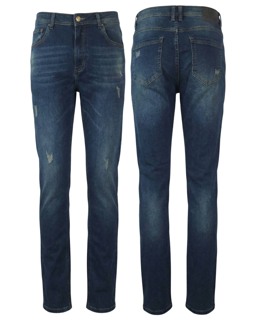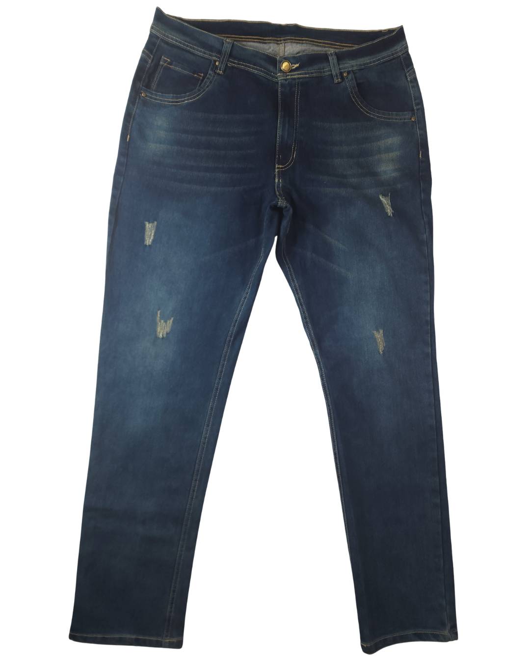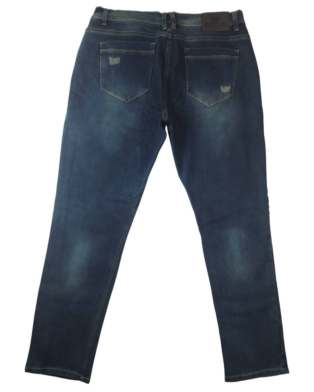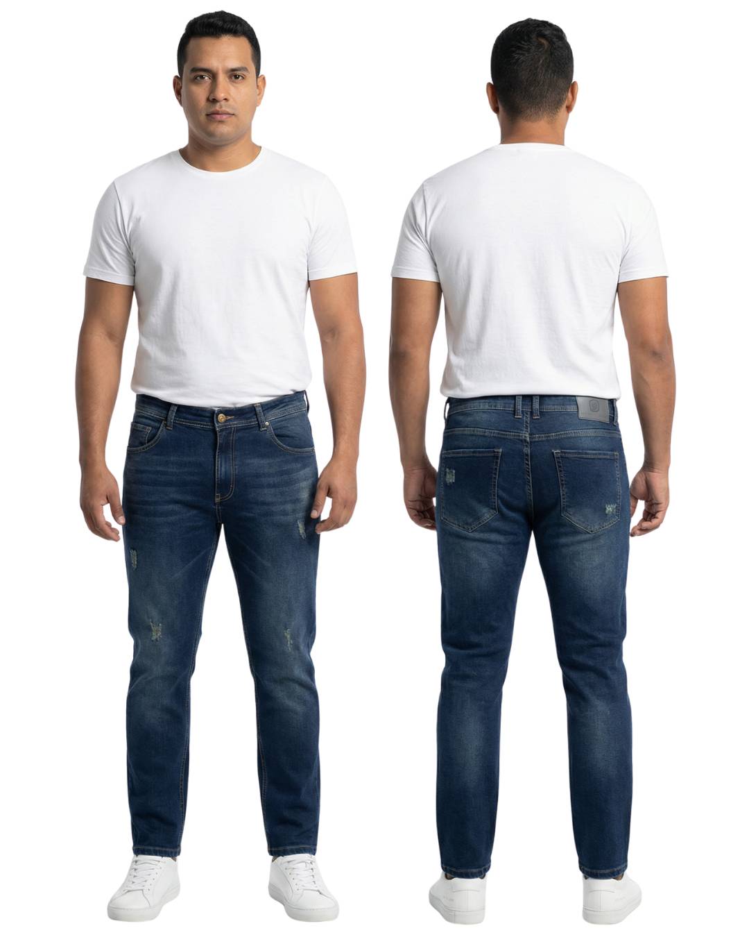 Su color azul medio oscuro con lavado de desgaste genera profundidad visual, mientras que los efectos tipo motor en piernas y bolsillos aportan textura y estilo sin recurrir a rotos.