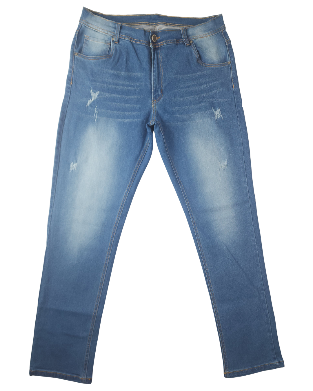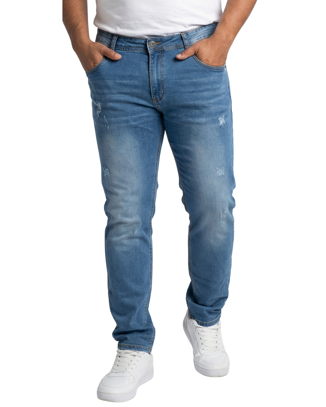 Su tono azul medio con lavado de desgaste le da profundidad, mientras que el efecto motor en piernas y bolsillos aporta textura visual y estilo sin necesidad de rotos.