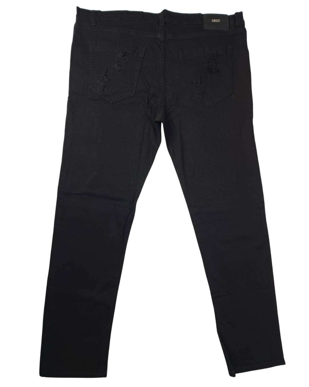Jean de hombre en denim negro licrado con rotos en delantero y bolsillos traseros. Bota slim, moderno, cómodo y con estilo urbano.