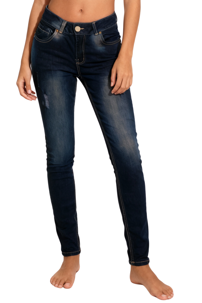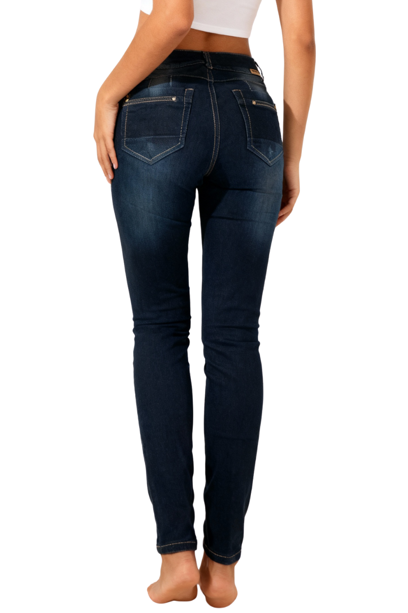 Estos jeans de mujer en corte Slim Fit (bota tubo) son el equilibrio perfecto entre un estilo clásico y la comodidad que ofrece la moda contemporánea. Confeccionados en un denim de color azul oscuro profundo, son altamente versátiles para cualquier look casual.