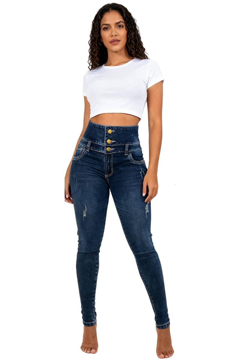Eleva tu estilo urbano con los jeans Skinny Fit dirty oscuro. Ref. 01611525. Esta prenda destaca por su tono azul profundo con procesos de lavado que le otorgan un aire vintage sofisticado. Su doble pretina escultural de 3 botones no solo es un detalle de diseño, sino que funciona como un sistema de control de abdomen para una silueta visiblemente más delgada.