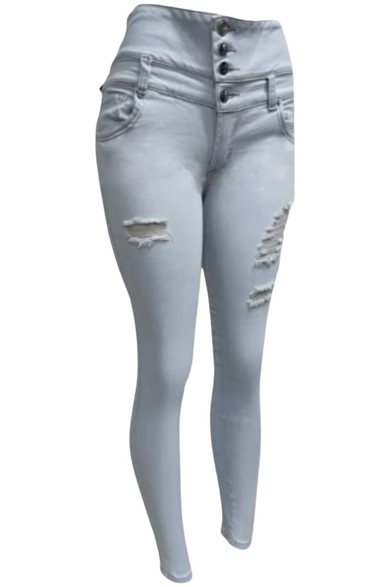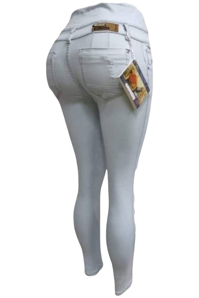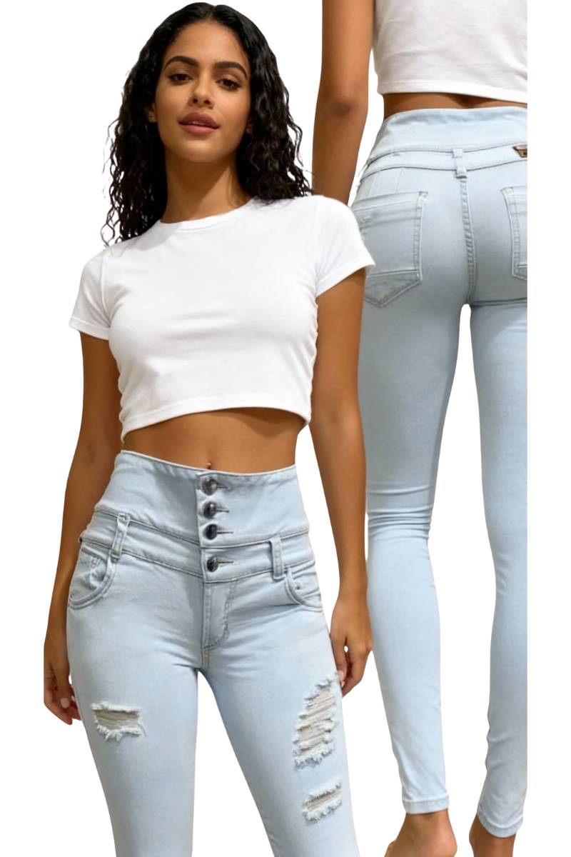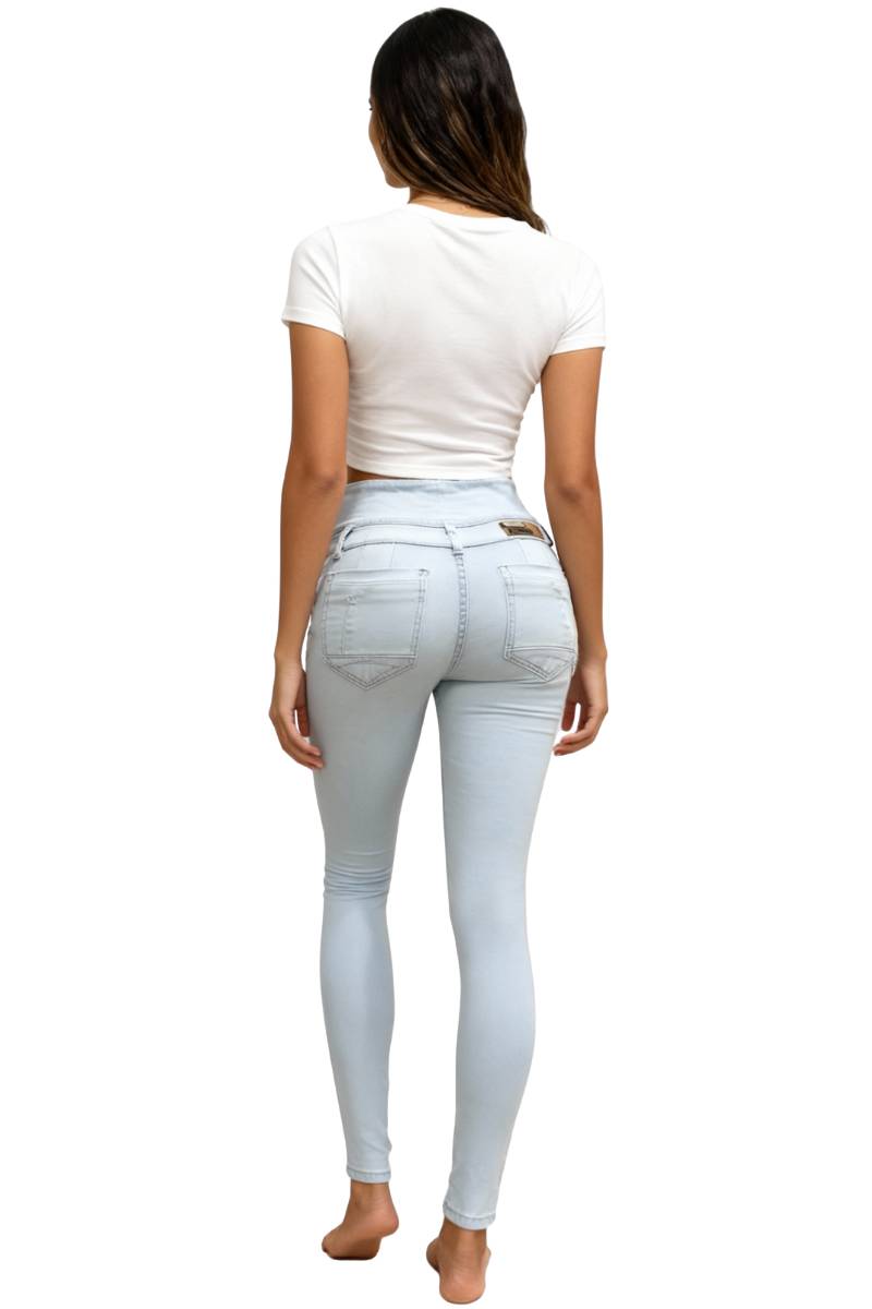 Logra una figura envidiable con nuestros jeans Skinny Fit color hielo. Ref. 01611510. Este modelo destaca por su innovadora doble pretina escultural con 4 botones, diseñada específicamente para brindar un control de abdomen total y definir la cintura de manera espectacular.
